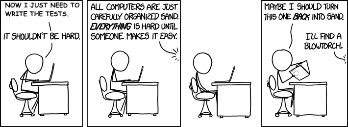 A little more technical than the other lessons, but like the title says testing is hard. And not just writing the tests can be a challenge, but thinking about what to tests, not testing to much, using TDD or not, naming your tests, keeping end-to-end tests stable, keeping tests up to date. And how about this one... not letting tests prevent easy refactoring while writing tests to allow easy refactoring... oh yes, I just said that...